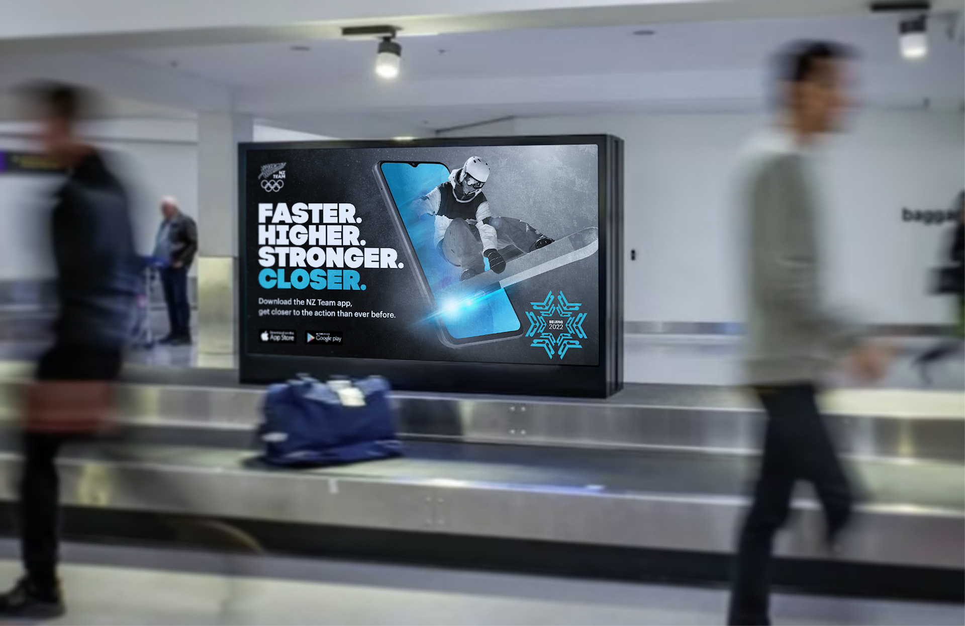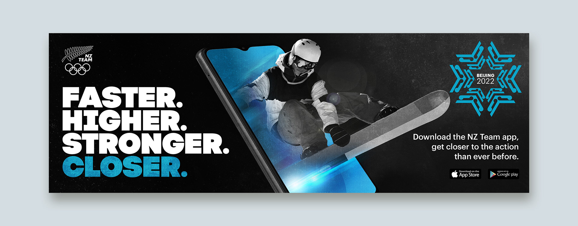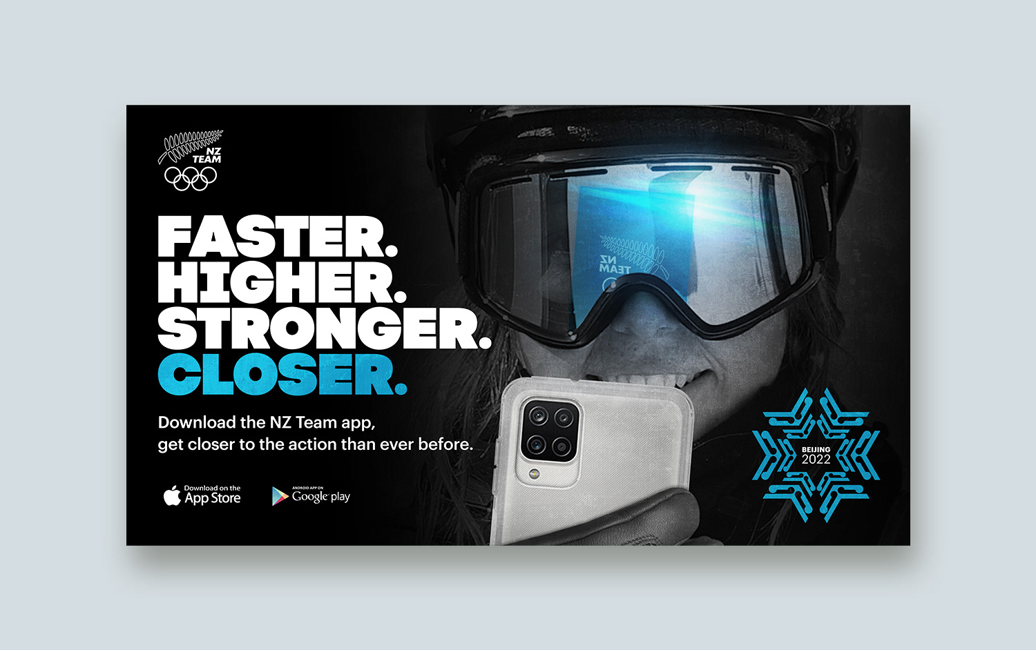 In the buildup to the Beijing Winter Olympics, the NZ Olympic Committee wanted to publicise their app off the back of an existing “Faster. Higher. Stronger.” campaign.