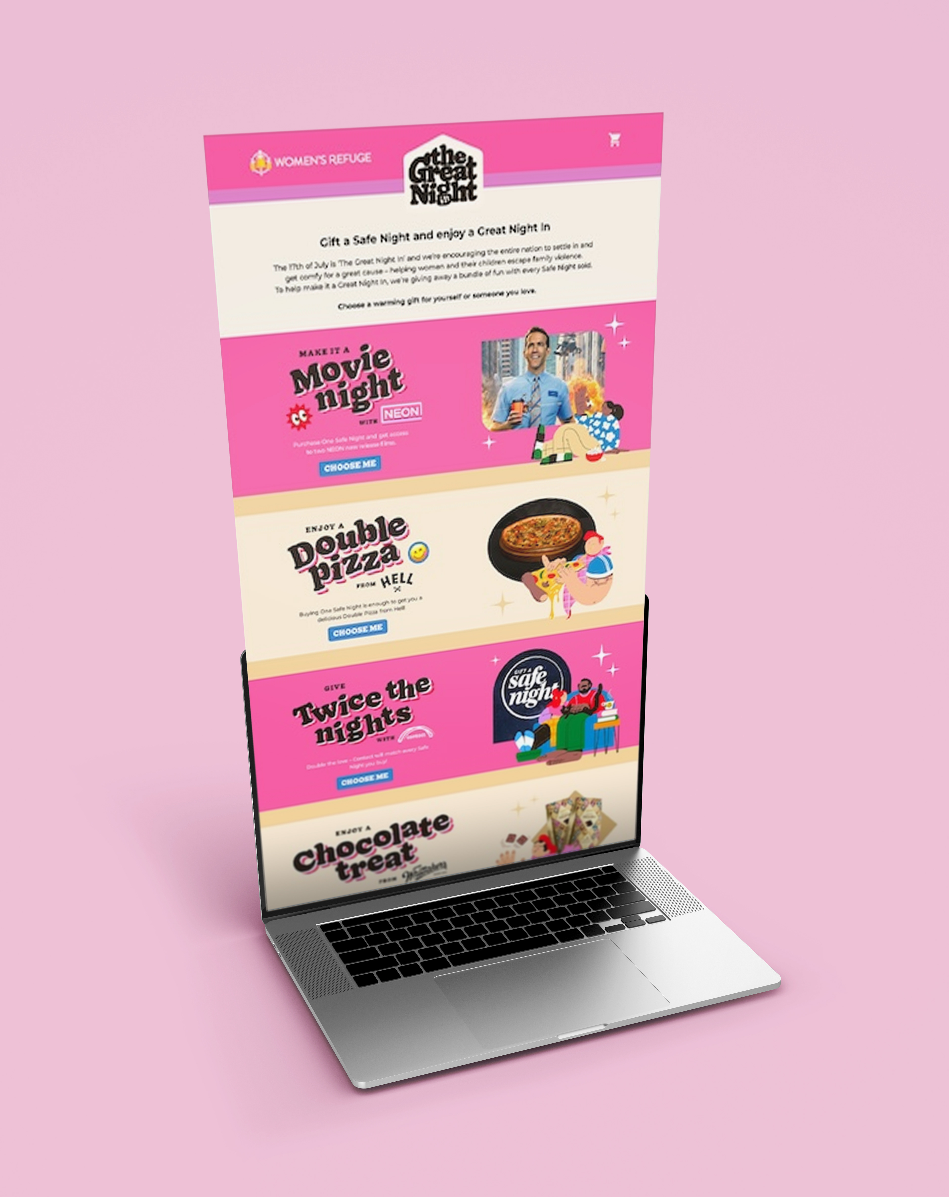 Inspired by little comforts, The Great Night In invited people to help by staying home. A $20 donation gave supporters a cozy night in—pizza, pamper packs, or movies—while helping provide safe shelter for those with nowhere else to turn. The campaign ran across TV, digital, social, print, and PR, with bundles selling out in just two weeks.